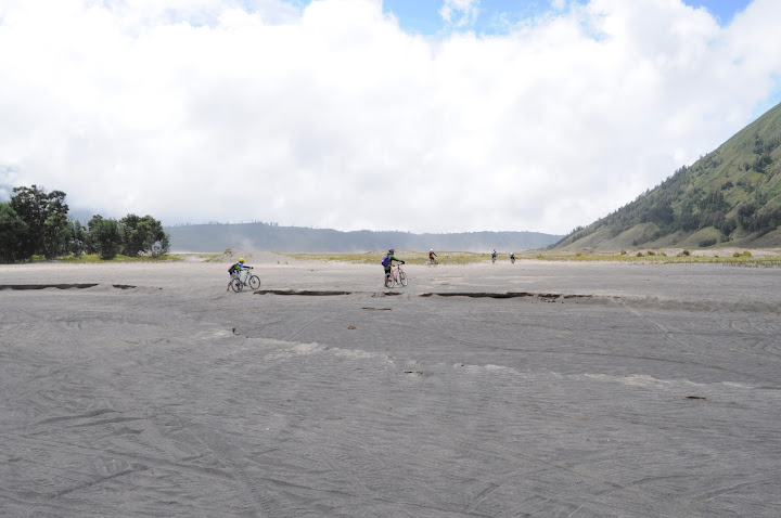 Musim panas membuat bromo penuh dengan debu. Selain sepeda susah dikayuh, pernafasan tidak leluasa karena musti memakai masker. Dari lautan pasir kami mengambil jalur memutari bromo utk sampai ke jemplang,dimana finish di coban pelangi - tumpang